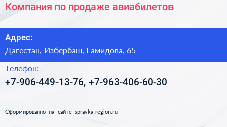 Компания по продаже авиабилетов по адресу Дагестан, Избербаш, Гамидова, 65 в дальнейшем Организация, размещена в следующих категориях: