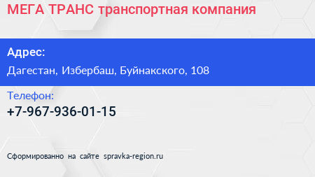 МЕГА ТРАНС, транспортная компания по адресу Дагестан, Избербаш, Буйнакского, 108 в дальнейшем Организация, размещена в следующих категориях: