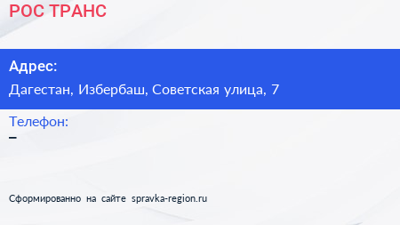 РОС - ТРАНС по адресу Дагестан, Избербаш, Советская улица, 7 в дальнейшем Организация, размещена в следующих категориях: