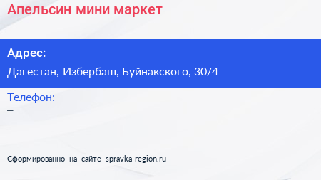 Апельсин, мини-маркет по адресу Дагестан, Избербаш, Буйнакского, 30/4 в дальнейшем Организация, размещена в следующих категориях:
