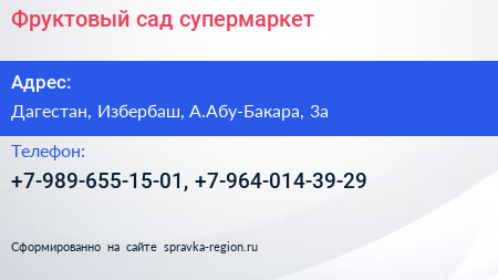 Фруктовый сад, супермаркет по адресу Дагестан, Избербаш, А.Абу-Бакара, 3а в дальнейшем Организация, размещена в следующих категориях: