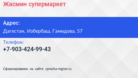 Жасмин, супермаркет по адресу Дагестан, Избербаш, Гамидова, 57 в дальнейшем Организация, размещена в следующих категориях: