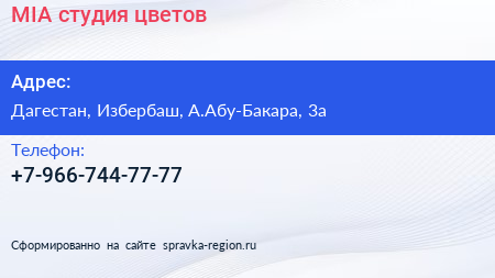MIA, студия цветов по адресу Дагестан, Избербаш, А.Абу-Бакара, 3а в дальнейшем Организация, размещена в следующих категориях:
