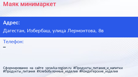 Маяк, минимаркет по адресу Дагестан, Избербаш, улица Лермонтова, 8в в дальнейшем Организация, размещена в следующих категориях: