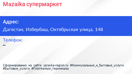 Mazaika, супермаркет по адресу Дагестан, Избербаш, Октябрьская улица, 148 в дальнейшем Организация, размещена в следующих категориях: