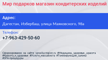 Мир подарков, магазин кондитерских изделий по адресу Дагестан, Избербаш, улица Маяковского, 98а в дальнейшем Организация, размещена в следующих категориях:
