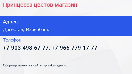 Принцесса цветов, магазин по адресу Дагестан, Избербаш, в дальнейшем Организация, размещена в следующих категориях: