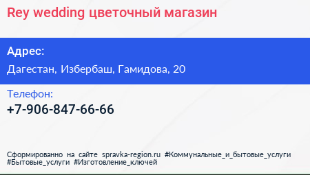 Rey wedding, цветочный магазин по адресу Дагестан, Избербаш, Гамидова, 20 в дальнейшем Организация, размещена в следующих категориях: