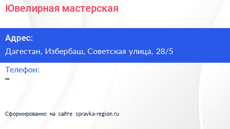 Ювелирная мастерская по адресу Дагестан, Избербаш, Советская улица, 28/5 в дальнейшем Организация, размещена в следующих категориях: