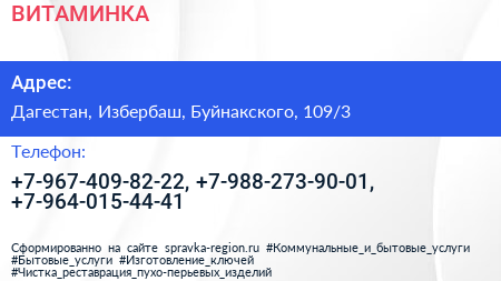 ВИТАМИНКА по адресу Дагестан, Избербаш, Буйнакского, 109/3 в дальнейшем Организация, размещена в следующих категориях: