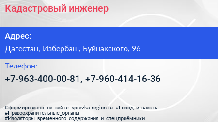 Кадастровый инженер по адресу Дагестан, Избербаш, Буйнакского, 96 в дальнейшем Организация, размещена в следующих категориях: