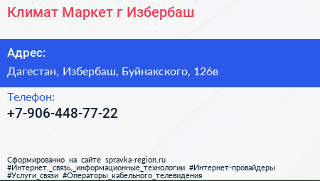 Климат Маркет, г. Избербаш по адресу Дагестан, Избербаш, Буйнакского, 126в в дальнейшем Организация, размещена в следующих категориях: