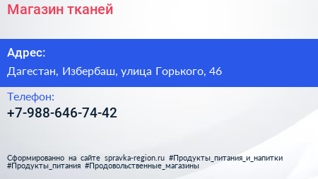 Магазин тканей по адресу Дагестан, Избербаш, улица Горького, 46 в дальнейшем Организация, размещена в следующих категориях: