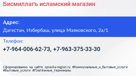Бисмиллагъ, исламский магазин по адресу Дагестан, Избербаш, улица Маяковского, 2а/1 в дальнейшем Организация, размещена в следующих категориях: