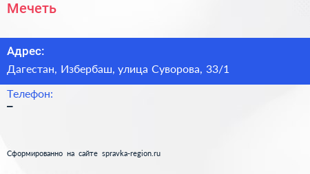 Мечеть по адресу Дагестан, Избербаш, улица Суворова, 33/1 в дальнейшем Организация, размещена в следующих категориях: