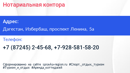 Нотариальная контора по адресу Дагестан, Избербаш, проспект Ленина, 5а в дальнейшем Организация, размещена в следующих категориях: