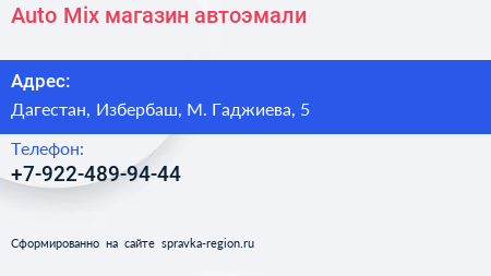 Auto Mix, магазин автоэмали по адресу Дагестан, Избербаш, М. Гаджиева, 5 в дальнейшем Организация, размещена в следующих категориях: