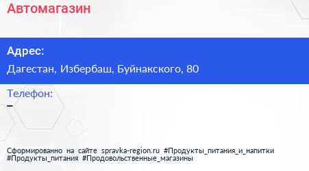 Автомагазин по адресу Дагестан, Избербаш, Буйнакского, 80 в дальнейшем Организация, размещена в следующих категориях:
