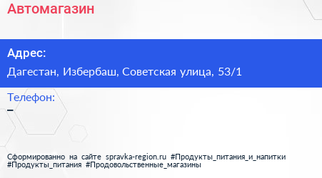 Автомагазин по адресу Дагестан, Избербаш, Советская улица, 53/1 в дальнейшем Организация, размещена в следующих категориях: