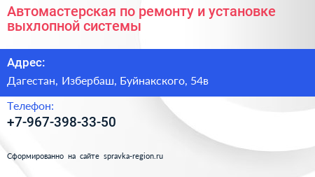 Автомастерская по ремонту и установке выхлопной системы по адресу Дагестан, Избербаш, Буйнакского, 54в в дальнейшем Организация, размещена в следующих категориях:
