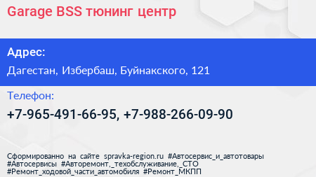 Garage BSS, тюнинг-центр по адресу Дагестан, Избербаш, Буйнакского, 121 в дальнейшем Организация, размещена в следующих категориях: