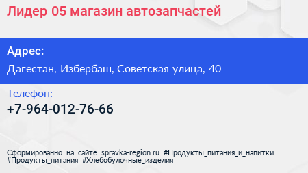 Лидер 05, магазин автозапчастей по адресу Дагестан, Избербаш, Советская улица, 40 в дальнейшем Организация, размещена в следующих категориях: