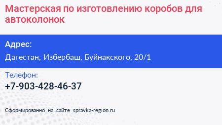Мастерская по изготовлению коробов для автоколонок по адресу Дагестан, Избербаш, Буйнакского, 20/1 в дальнейшем Организация, размещена в следующих категориях: