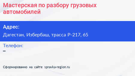 Мастерская по разбору грузовых автомобилей по адресу Дагестан, Избербаш, трасса Р-217, 65 в дальнейшем Организация, размещена в следующих категориях: