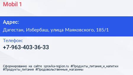 Mobil-1 по адресу Дагестан, Избербаш, улица Маяковского, 185/1 в дальнейшем Организация, размещена в следующих категориях: