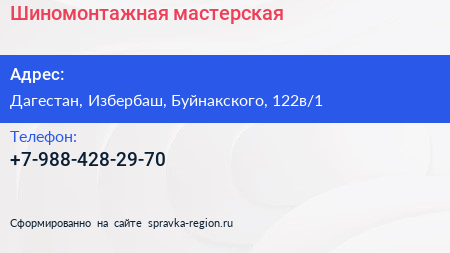 Шиномонтажная мастерская по адресу Дагестан, Избербаш, Буйнакского, 122в/1 в дальнейшем Организация, размещена в следующих категориях: