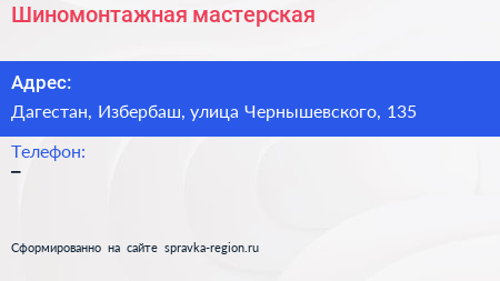 Шиномонтажная мастерская по адресу Дагестан, Избербаш, улица Чернышевского, 135 в дальнейшем Организация, размещена в следующих категориях: