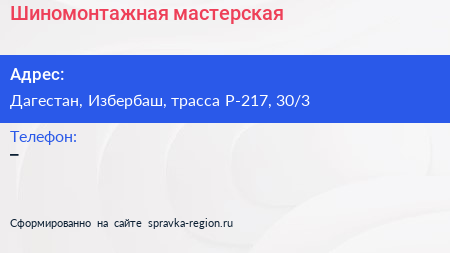 Шиномонтажная мастерская по адресу Дагестан, Избербаш, трасса Р-217, 30/3 в дальнейшем Организация, размещена в следующих категориях: