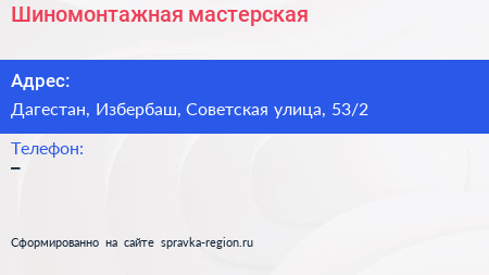 Шиномонтажная мастерская по адресу Дагестан, Избербаш, Советская улица, 53/2 в дальнейшем Организация, размещена в следующих категориях: