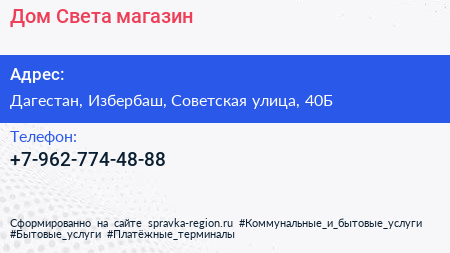 Дом Света, магазин по адресу Дагестан, Избербаш, Советская улица, 40Б в дальнейшем Организация, размещена в следующих категориях: