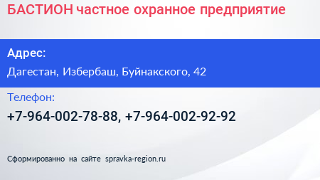 БАСТИОН, частное охранное предприятие по адресу Дагестан, Избербаш, Буйнакского, 42 в дальнейшем Организация, размещена в следующих категориях: