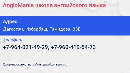 AngloMania, школа английского языка по адресу Дагестан, Избербаш, Гамидова, 83Б в дальнейшем Организация, размещена в следующих категориях: