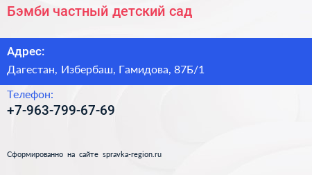 Бэмби, частный детский сад по адресу Дагестан, Избербаш, Гамидова, 87Б/1 в дальнейшем Организация, размещена в следующих категориях: