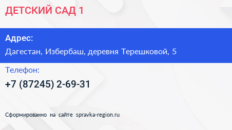 ДЕТСКИЙ САД № 1 по адресу Дагестан, Избербаш, деревня Терешковой, 5 в дальнейшем Организация, размещена в следующих категориях: