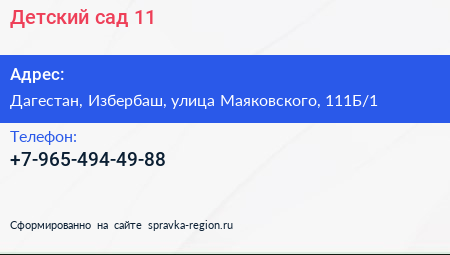 Детский сад №11 по адресу Дагестан, Избербаш, улица Маяковского, 111Б/1 в дальнейшем Организация, размещена в следующих категориях: