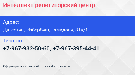 Интеллект, репетиторский центр по адресу Дагестан, Избербаш, Гамидова, 81а/1 в дальнейшем Организация, размещена в следующих категориях: