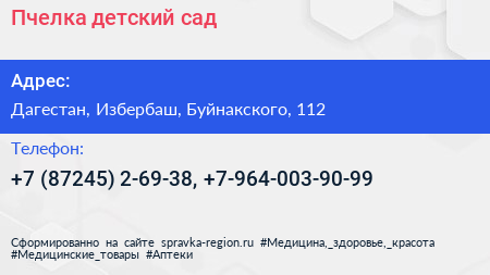 Пчелка, детский сад по адресу Дагестан, Избербаш, Буйнакского, 112 в дальнейшем Организация, размещена в следующих категориях: