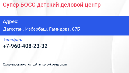 Супер БОСС, детский деловой центр по адресу Дагестан, Избербаш, Гамидова, 87Б в дальнейшем Организация, размещена в следующих категориях: