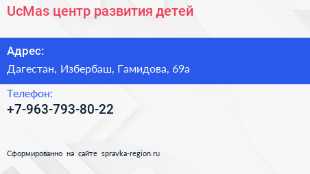 UcMas, центр развития детей по адресу Дагестан, Избербаш, Гамидова, 69а в дальнейшем Организация, размещена в следующих категориях: