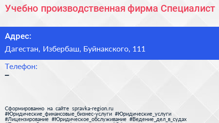 Учебно-производственная фирма Специалист по адресу Дагестан, Избербаш, Буйнакского, 111 в дальнейшем Организация, размещена в следующих категориях: