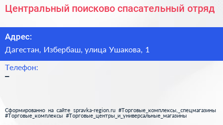 Центральный поисково-спасательный отряд по адресу Дагестан, Избербаш, улица Ушакова, 1 в дальнейшем Организация, размещена в следующих категориях: