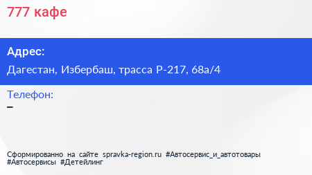777, кафе по адресу Дагестан, Избербаш, трасса Р-217, 68а/4 в дальнейшем Организация, размещена в следующих категориях: