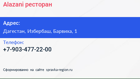 Alazani, ресторан по адресу Дагестан, Избербаш, Барвиха, 1 в дальнейшем Организация, размещена в следующих категориях: