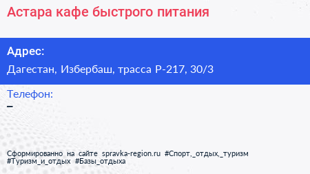 Астара, кафе быстрого питания по адресу Дагестан, Избербаш, трасса Р-217, 30/3 в дальнейшем Организация, размещена в следующих категориях: