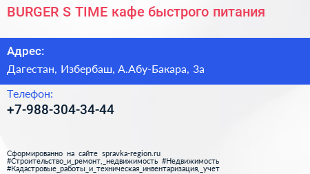 BURGER`S TIME, кафе быстрого питания по адресу Дагестан, Избербаш, А.Абу-Бакара, 3а в дальнейшем Организация, размещена в следующих категориях: