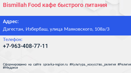 Bismillah Food, кафе быстрого питания по адресу Дагестан, Избербаш, улица Маяковского, 108а/3 в дальнейшем Организация, размещена в следующих категориях: